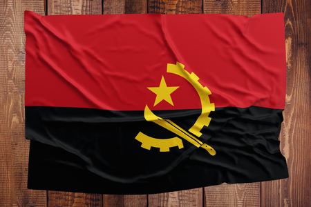 Flag of Angola on a wooden table background. Wrinkled Angolan flag top view.