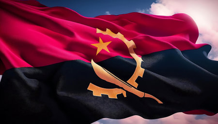 Category: showing the flag of angola with its emblem of a machete and star waving in the sky keywords: angola, flag, angolan flag, national symbol,...