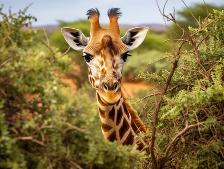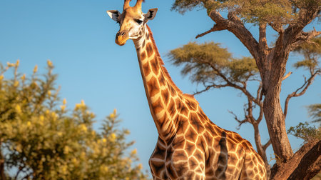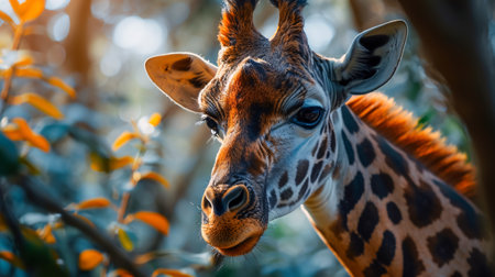 The elegant giraffe, with its spotted pattern, looks at camera generated by artificial intelligence
