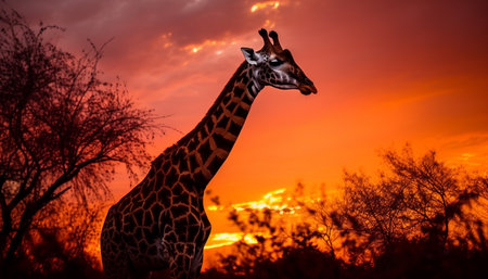 Tranquil giraffe silhouette standing in the beauty of African sunset generated by artificial intelligence