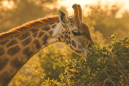 Giraffe grazing from the top of a tree in the savannah. Golden hour lighting and a natural habitat background. Generative AI