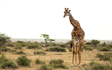 One Giraffe walks high in the dry African savannah landscape between plants. Generative AI