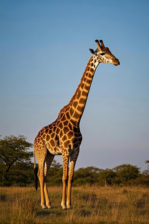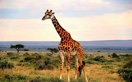The elegant giraffe standing in the savannah, looking at sunset generated by artificial intelligence