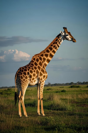 African giraffe standing in the savanna with blue sky and clouds. Wildlife, animal, safari, nature concept.