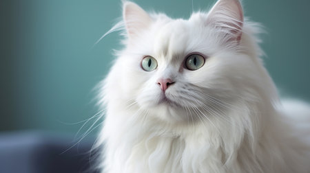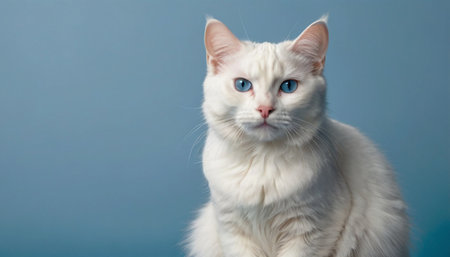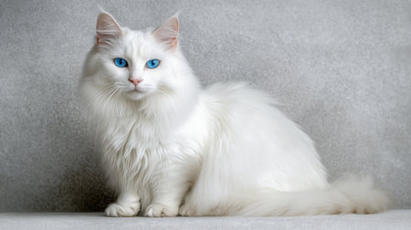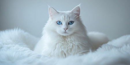 This stunning portrait captures a fluffy white cat with silky fur and piercing blue eyes, showcasing its elegance and serene personality in soft lighting.