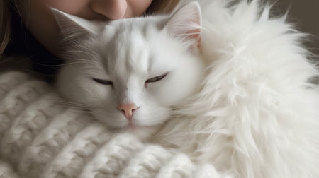 A fluffy white cat snuggling with its owner. AI generated illustration