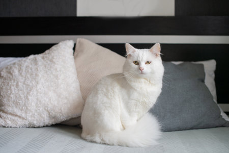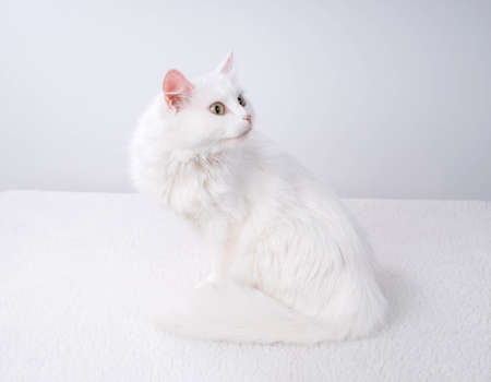 Cute big white cat with a fluffy tail sitting on the bed looking away