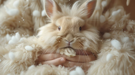 Angora rabbit grooming session, displaying fine yarn and warm winter accessories