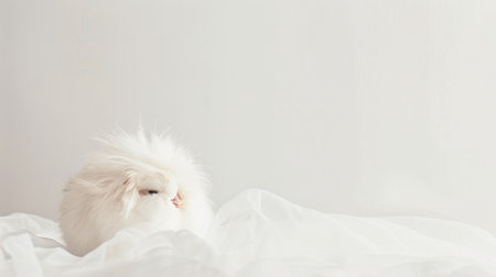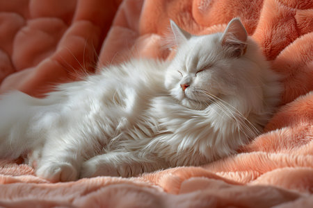 A gentle moment capturing a tranquil feline with silky white fur and a delicate pink nose, peacefully resting in a cozy, sunlit setting.