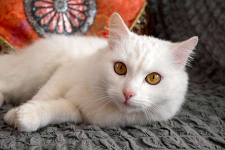 beautiful fluffy white cat rests on a grey sofa near an orange pillow