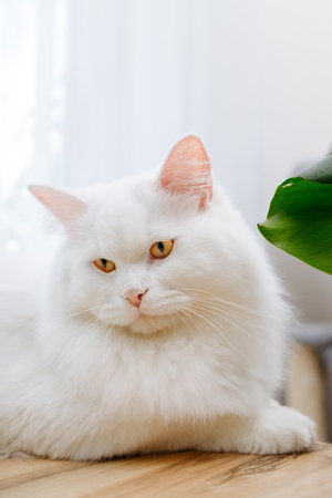 A fluffy white cat sits near a window, its blue eyes gazing outwards. The image features soft lighting and a shallow depth of field, highlighting the cat's fur. Green plants provide a natural backdrop in an indoor setting. Suitable for various editorial and commercial applications.