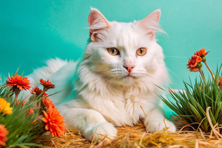 Beautiful white cat with orange flowers on green background. Studio shot.