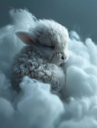 This tranquil image captures a baby lamb curled up in a serene nap, surrounded by plush, cloud-like textures. The soft focus and muted color palette highlight the lamb's gentle features and peaceful expression, emphasizing the tenderness and tranquility of the scene. This photograph is perfectly suited for projects that require visuals depicting serenity, pastoral life, or the nurturing aspects of nature. It offers a peaceful glimpse into the quiet moments of a lamb's life, making it a charming addition to any collection focusing on young farm animals or soothing natural environments.