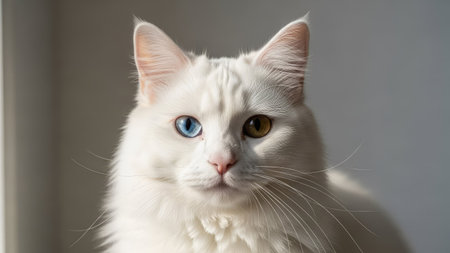 A close-up view presents a pristine white cat with distinct blue and brown eyes, set against a neutral, diffused background. The fur appears soft, illuminated by gentle lighting. The composition is straightforward and the image provides potential for versatile applications in design or editorial projects.