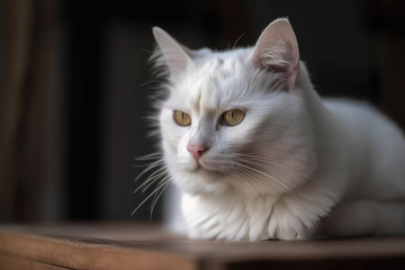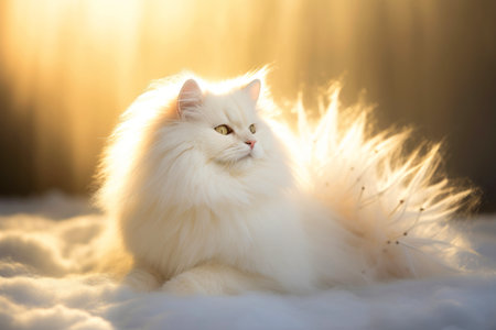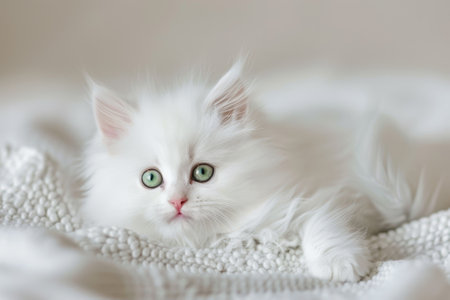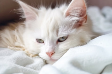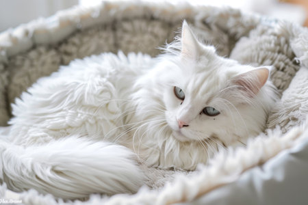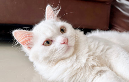 A close-up view presents a pristine white cat with fluffy fur, gazing directly at the viewer. The image showcases soft textures and natural illumination, suggesting an indoor environment. This image could be used for various commercial or editorial purposes related to pets or domestic animals.