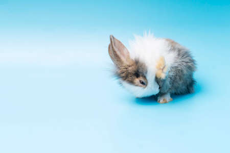 Cute adorable brown and white rabbit cleaning foot while sitting on isolated blue background. Lovely baby bunny alone sit on blue background. Easter concept.
