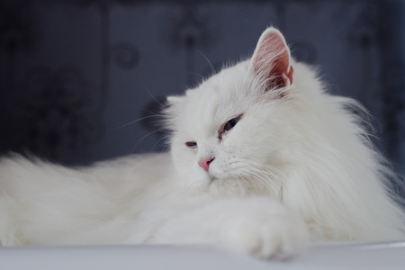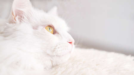 Portrait of a beautiful white Angora cat in profile. Portrait of fluffy white Turkish angora close-up.
