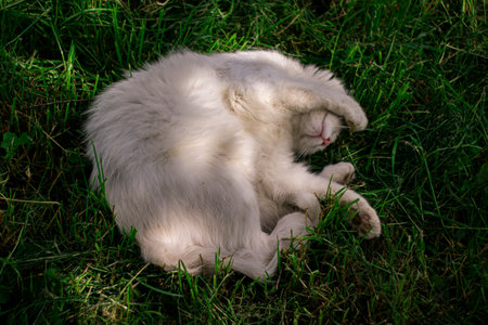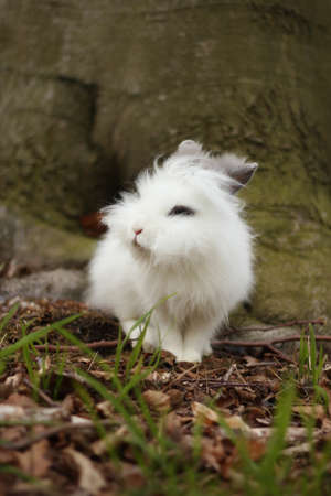 Cute Newzealand white rabbit, lion head rabbit on green grass