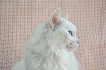 a cute white Angora cat with beautiful blue eyes is sitting on the sofa on a pink blanket and angrily looking straight ahead. Portrait of fluffy white Turkish angora close-up