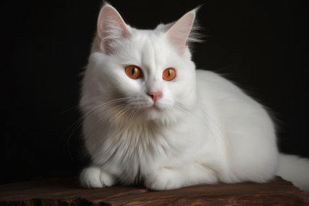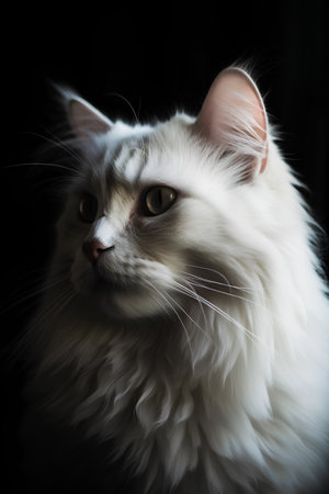 AI Generated. Majestic white cat with striking amber eyes gazing into the distance on black background