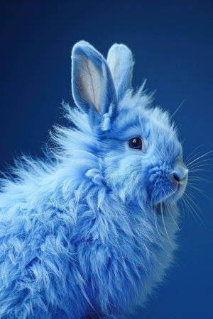 Fluffy blue rabbit with long ears against a gradient blue background Unique and whimsical creature, showcasing vibrant color and texture