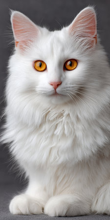 Elegant Turkish Angora Cat with Striking Amber Eyes Posing Gracefully on a Neutral Studio Background
