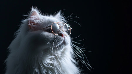 white furry cat in fashion eyeglasses. Studio neon light. Luxurious domestic kitty in glasses