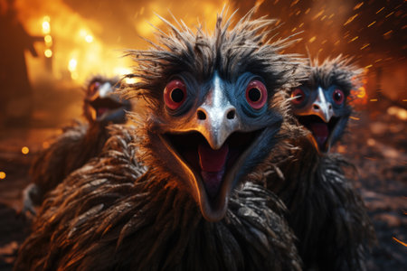 Ostrich with burning eyes in the forest. Halloween concept.