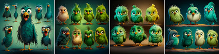 4 photos, Follow the adventures of green bird characters on the street. Each character has a unique personality and story. Ideal for children's entertainment and education.
