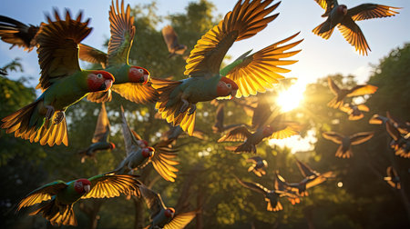Witness the breathtaking beauty of a large group of parrots gracefully soaring through the Amazon rainforest at sunset, as sunbeams pierce through the foliage. A truly mystical experience that will leave you in awe.