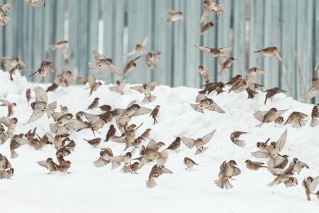 sparrows fly and sit in the snow