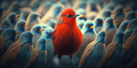 Difference concept showing by extraordinary bird standing out of the crowd. superlative generative AI image.