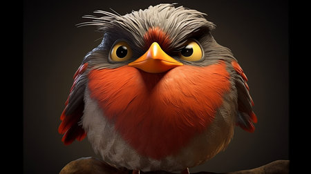 an angry bird perches on a branch, showcasing its vibrant red, gray, and gray feathers. the bird's appearance is reminiscent of caricature-like illustrations, hyper-realistic portraits, and animated gifs. the image captures the characterful essence of the bird, with sharp focus and a terracotta-like texture. ai generated