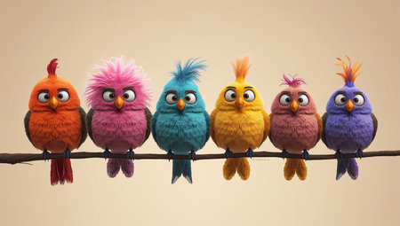 Colorful bird figurines in a row against a pink and blue background.