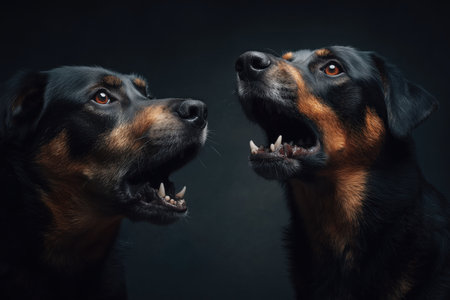 This image features two rottweiler dogs barking, showcasing their expressive faces and strong features. The dark background highlights their fur and intense expressions, making it a striking portrait of these loyal companions. ai generated.