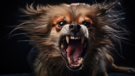Furious dog on black background closeup view. Aggressive animal posing threat. Generative AI