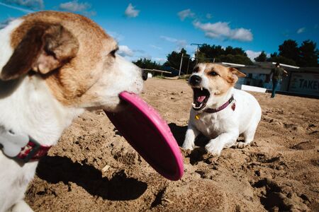 two Jack Russell Terriers playing with a toy on the beach. close up