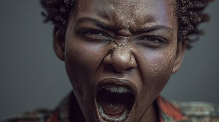 Close-up portrait of a young woman with intense expression, shouting with her mouth wide open, conveying strong emotions of anger and frustration