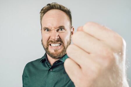 Handsome adult man, wearing green shirt showing fist with angry expression, while standing over gray background