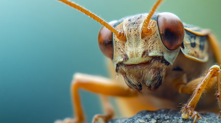 This stunning close-up image showcases a cricket with intricate details, highlighting its features and textures against a subtle gray background.