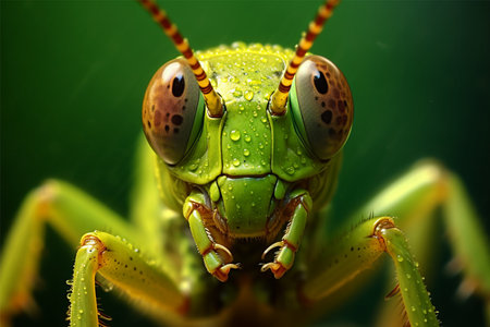 A striking macro shot captures a green grasshopper head-on, showcasing its intricate details, from its textured exoskeleton to its prominent eyes and antennae, set against a soft green background.