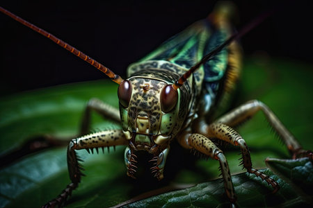 This captivating close-up photograph showcases a cricket, highlighting intricate details and textures of its body, set against a dark background.