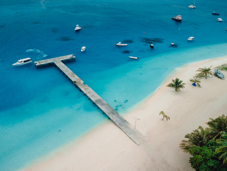 Aerial view of Maldives tropical beach with pier and speed boats on island. Travel vacation concept on Fulidhoo island.