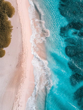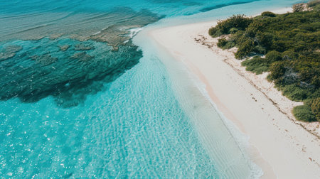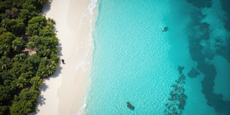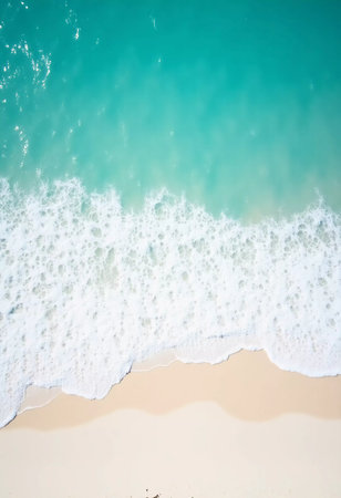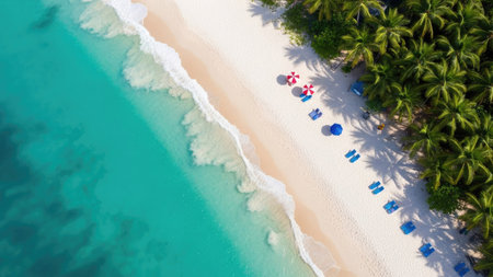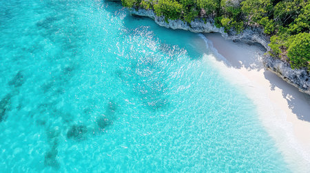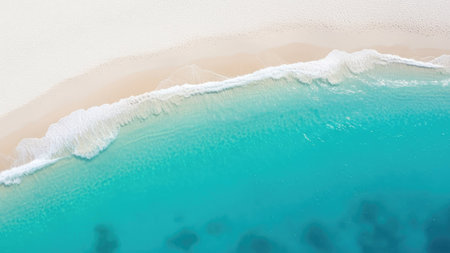 Breathtaking aerial view of turquoise water gently washing a pristine white sand beach in a tropical paradise, creating a stunning seascape