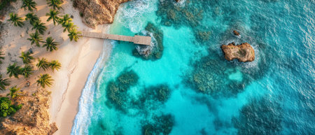 Generative AI : Beautiful caribbean beach in Dominican Republic Aerial abstract view of tropical idyllic summer landscape with clear transparent blue sea water and wooden red pier