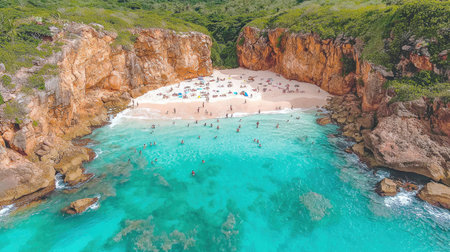 Aerial view of a double beach in Favela G7, in the style of Henri Rousseau. The picturesque scene captures the natural beauty and tropical charm with lush greenery on both sides of rocky cliffs leading to crystal-clear turquoise waters at each sandy white beach. A group of people can be seen enjoying their time by swimming or sunbathing near the rocks. In the background, you see jungle forest trees and red rock mountains. The photo was taken from a drone's perspective. High resolution. --chaos 30 --ar 16:9 --quality 2 --stylize 500 --v 6.1 Job ID: 2973264c-6ebb-4fff-8952-8b74b40cf086