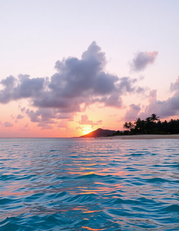 A serene beach showcases vibrant turquoise waters lapping at golden sands. Tall palm trees sway gently in the warm sun, creating a peaceful tropical atmosphere perfect for relaxation and serenity.
