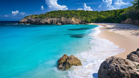Art beach scene with gentle waves, sandy shoreline. Bright colors create peaceful atmosphere. Generated AI. Sunny beach holidays travel concept. Copy space. Sunny tropic paradise. Plage background.