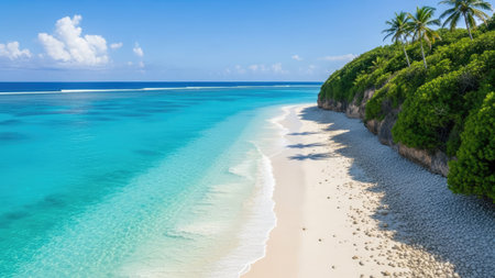 This stunning aerial perspective showcases a tropical beach with pristine white sand and inviting turquoise water. Lush palm trees gently sway in the warm breeze under a clear blue sky.