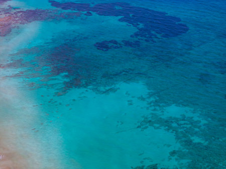 Explore the breathtaking aerial view of a turquoise ocean showcasing vibrant coral reefs and rugged rocky formations, perfect for travel enthusiasts.